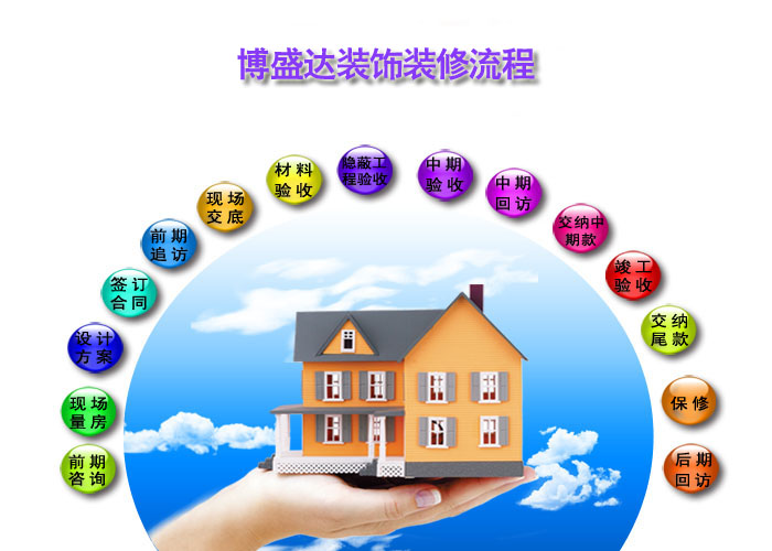 博盛达装饰装修流程 博盛达装饰装修流程一、家装咨询及工程造价概算 网络家居顾问解答您所关心的每一个问题,提供公司的工程样板及有关服务内容的资料。设计师根据您的要求,对您的居室装修提供关于设计、材料及工艺等方面的参与意见并就工程造价作初步概算。 二、现场测量 如果您对我们有了初步的信任,设计师可到您将要装修的居室进行实地测量,了解现场的具体情况,测量时设计师与您约定看方案的时间。 博盛达装饰装修流程三、方案设计及工程预算 现场测量后三至五天内,设计师做出平面方案图,并根据测量数据和您要求的装修项目,做出工程预算,并与您联系确定具体看方案的时间。博盛达装饰装修流程,因为专业,所以专注,博盛达装饰16年厂房、办公室、商铺、家庭装修经验,是你最佳的选择,我们的价格绝对实在,不含半点水分!博盛达装饰做到百分之百有保障,以一言九鼎重千金作为自己的承诺,努力把每一个工地都打造成一块金字招牌! 四、确定设计方案及工程预算 如果您对初步的设计方案及工程预算满意,可以和设计师确定方案,设计师根据确定的方案做出施工图,并确定最终工程预算。 博盛达装饰装修流程五、签订合同 根据您认可的设计图纸和工程预算,签订施工合同,约定开工日期。根据合同约定,您须按照所签订的合同模式付首期65%款。 六、现场技术交底 签订合同3日内,您将和我们的设计师、施工质检、工长(施工经理)、各技术组长,一同进行现场技术交底。 博盛达装饰装修流程七、施工期间 施工期间,工程巡检员负责检查工程质量、工程进度;设计师负责检查设计方案在施工中落实,负责与您办理工程更恰商、协助检查、监督工程质量;工程助理负责处理工程问题;根据合同约定工程过半时(油漆工进场前),您须交纳中期32%的工程款和增项款。 八、工程验收 工程完工后,经验收合格,您在验收单上签字,并按合同及恰商记录付齐尾款3%的工程款,并签署保修单。 博盛达装饰装修流程九、后续服务 工程完工后,我们全程客服跟踪。实行两年质保,终身维护。水电五年质保。